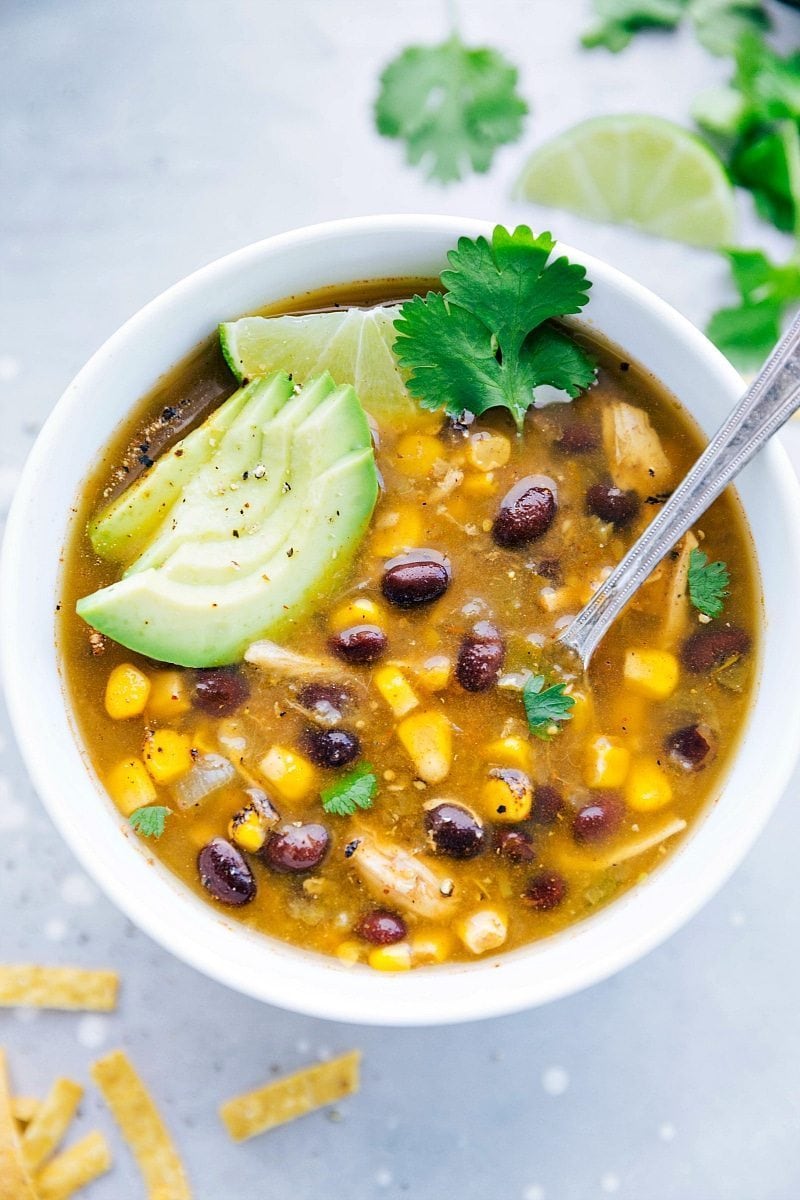 - Slow Cooker Salsa Verde Chicken Soup – Chicken, black beans, fire roasted corn, lime juice, and more. You can top this hearty soup with cheese, avocado, sour cream (I like to use plain Greek yogurt), and more.